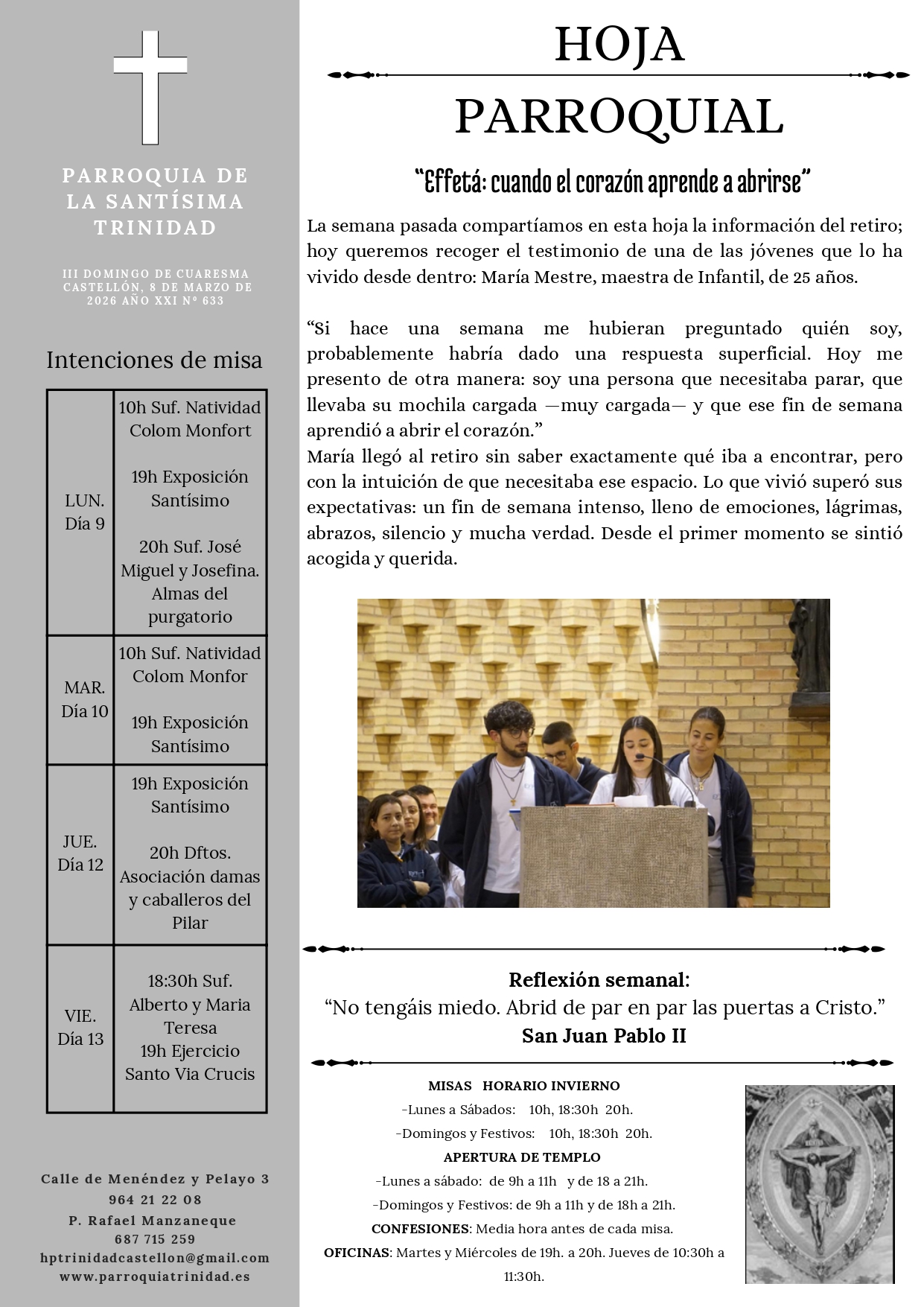 El retiro le ha enseñado a amar y, sobre todo, a dejarse amar. Se va con una paz profunda, difícil de expresar con palabras, y con heridas sanadas que llevaba tiempo guardando. Desde entonces, la Eucaristía y la Hora Santa han dejado de ser algo opcional para convertirse en una necesidad vital, en el lugar donde sostener y